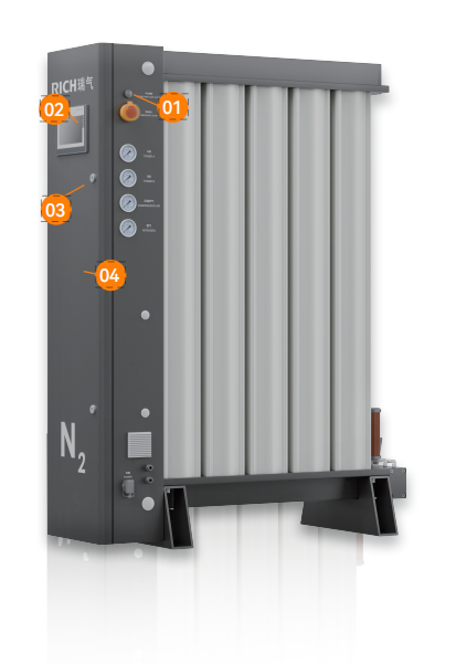PNK制氮機根據(jù)變壓吸附原理(PSA),從潔凈的壓縮空氣中持續(xù)分離出氮氣。